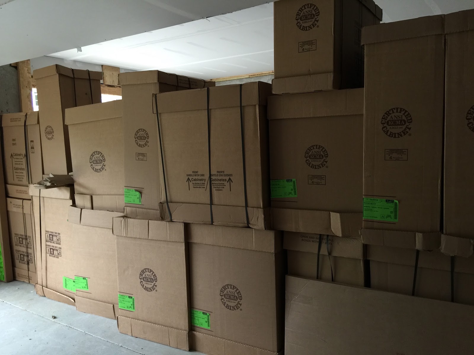 Wednesday evening we drove to the homesite again thinking they might have gotten our brick by now. The brick was not there but oh my, the garage was FULL of the goodies. Doors, screen door, CABINETS, vanities and my cute mailbox.